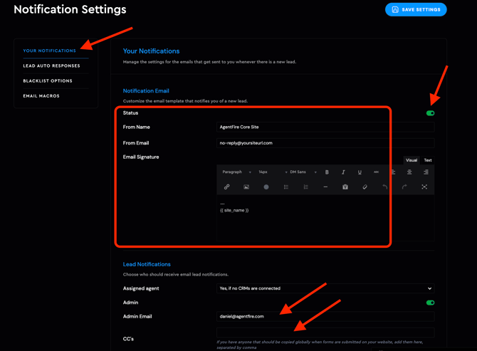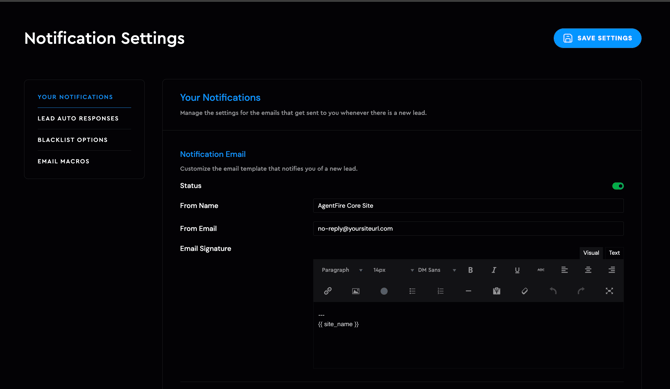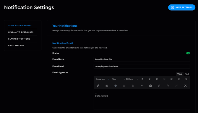 - Your Notification settings - these are enabled by default. This allows you to personalize your new lead notification email template by editing the From Name, From Email address, and email signature: