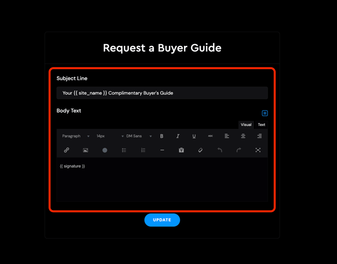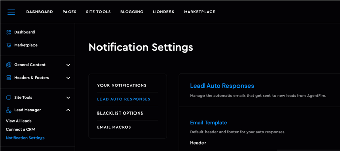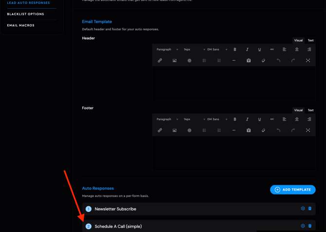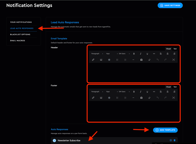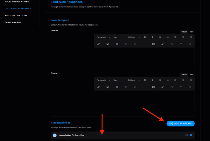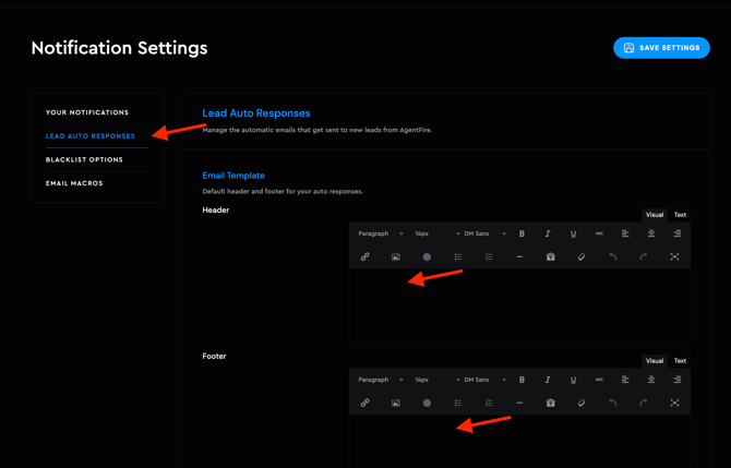 • Toggle return user notifications on or off - Lead auto responses - from this section, you can easily edit the email header and footer, as well as access the new email macros tab and editors: