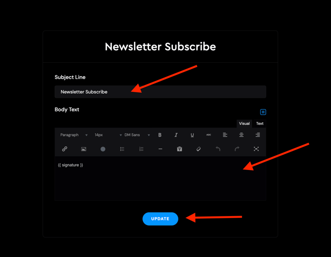 Your newsletter notification is a default set of text that responds when an end user submits a request through one of your newsletter sign up forms, typically used in an Engage template.