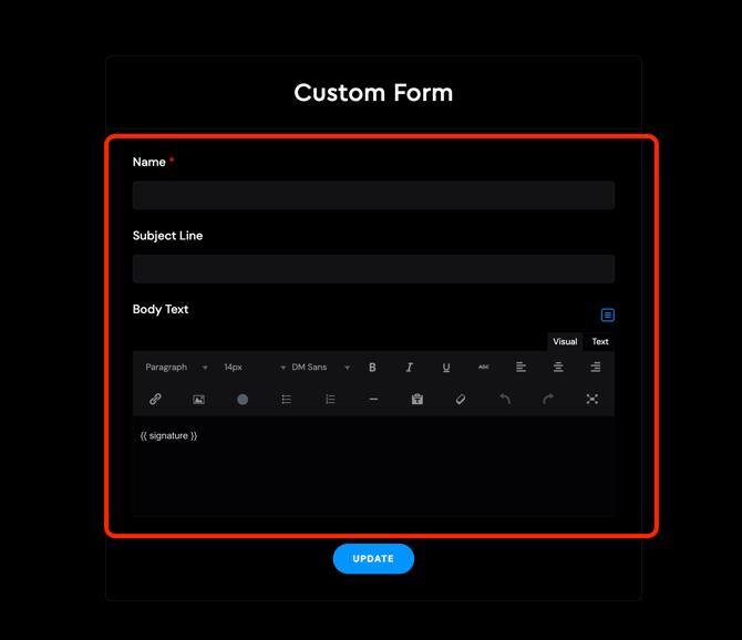 If you would like to include your image, logo, or other contact information into the templates of your response emails, you may click the Email Template tab to view and edit the Header and Footer of your emails in Visual or Text editing modes.