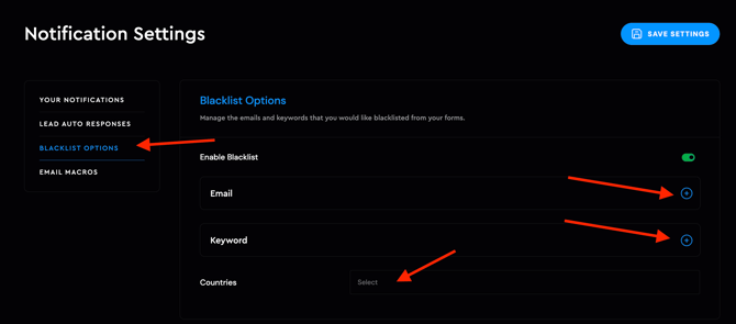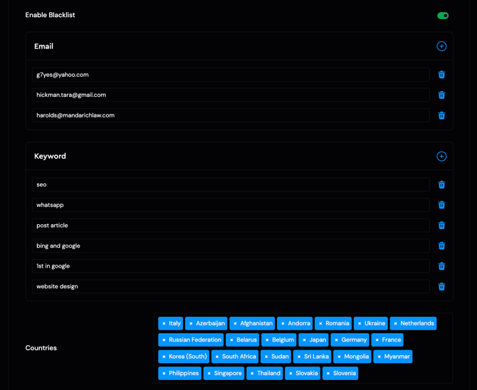 - Blacklist options (spam filtering) - Use this tab to add unwanted email addresses, block spammers using frequent or repetitive keywords, or block countries that consistently generate spam. Simply navigate to this section and add your filters as shown below: