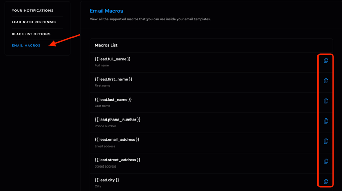 - Email Macros - Easily view, access, and copy shortcuts for the email macros available on the platform: