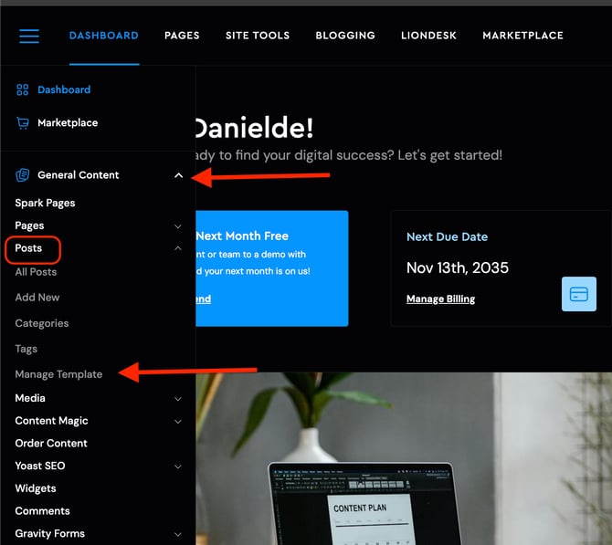 To manage your blog’s template, head over to the Burger Menu - General Content - Posts - Manage Template as shown below: