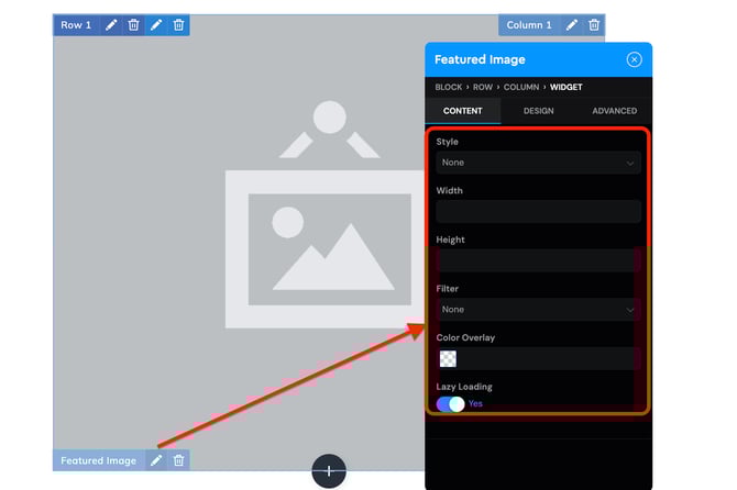 Use the featured image widget, similar to the image widget from the Spark Creator. You can change the style (thumbnail, rounded, or circle), adjust width and height, add filters, or apply a color overlay: