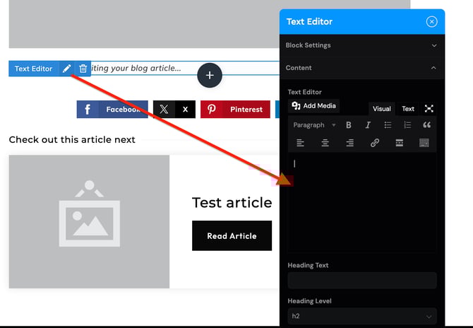 Blogs now include the text editor widget by default. Click directly on it to begin adding your content: