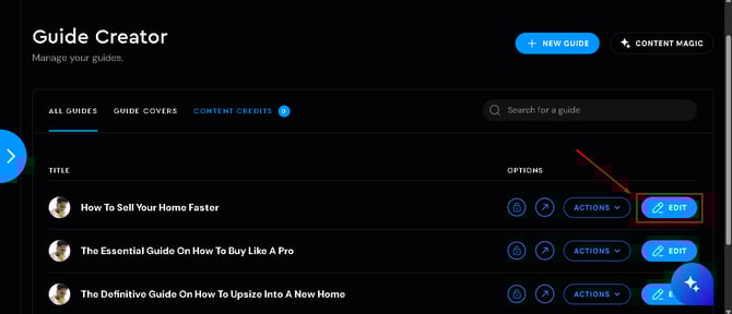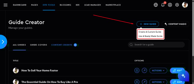 (NOTE: If you are wanting to edit a new or templated guide, select "New Guide", then browse through the templates or choose "Create A Custom Guide" to add in a blank guide.)