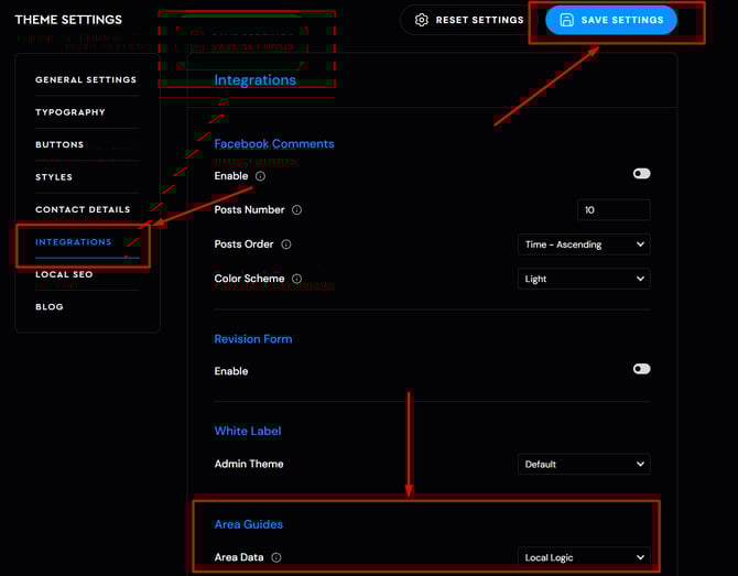 From the Theme Settings, navigate to the "Integrations" section, scroll down to find "Area Guides". Turn on "Local Logic" and hit "Save Settings."