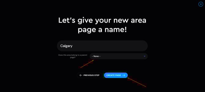 Finalize and create the new area page. Also, you can select the parent page.