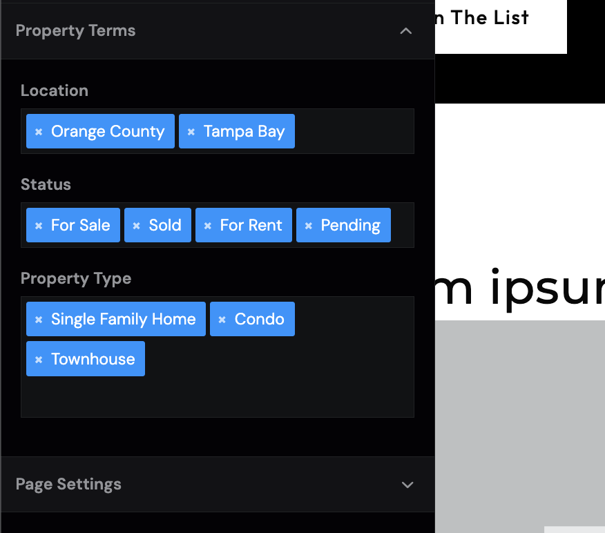 - Property Terms - this section allows you to define the location, status, and property type terms. These terms are used to filter listings when displayed in sliders or on a custom feed page. The status typically appears on the listing page template and within sliders as a banner, depending on your template design.