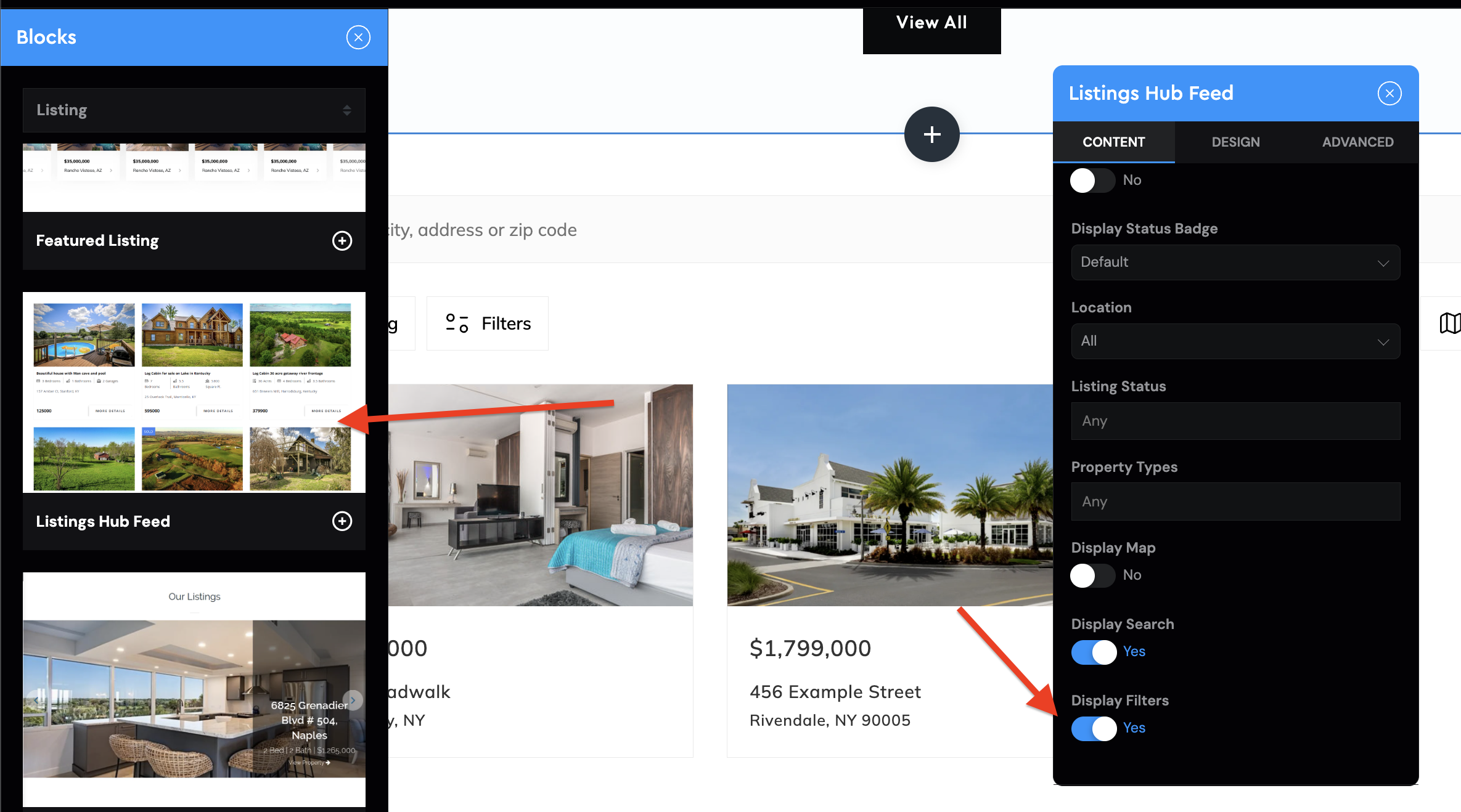 Next on the 'pages section' look up for the Listings HUB Feed template and toggle on the 'display filters' option: