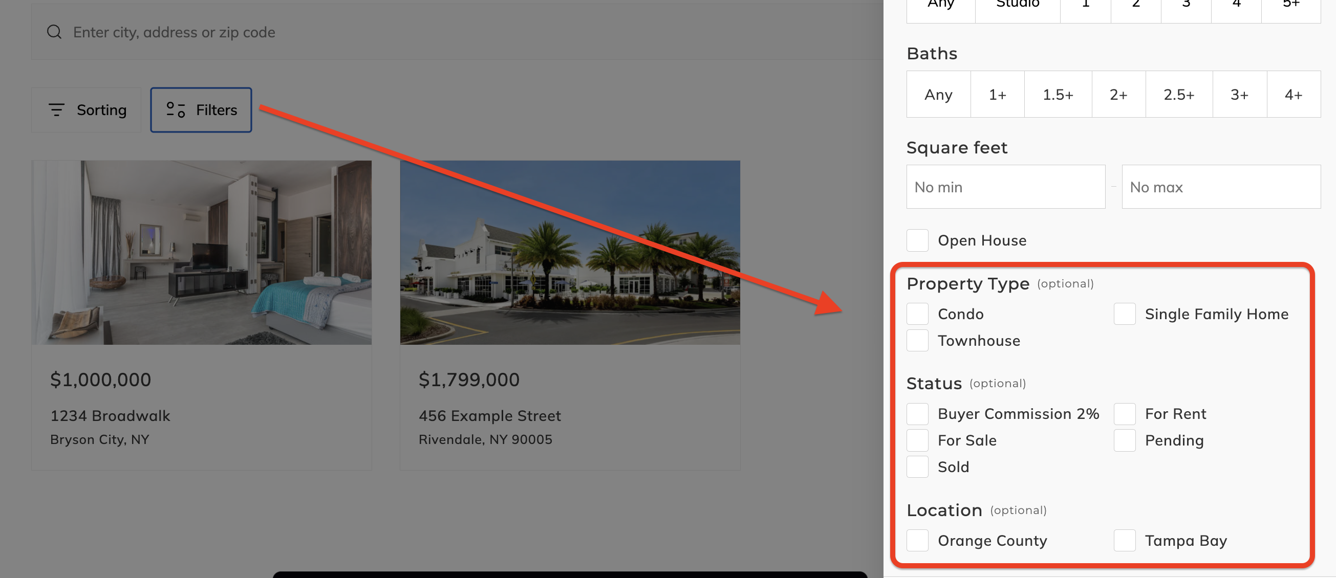When creating new property tags for Location, Status and Property type these will be automatically added as filters for the Listings Feed template: